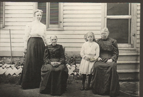 L to R: Minnie Otillie Goeglein Meier (standing), Otillie Mees Goeglein (sitting), Marie Meier Meckle (little girl) and Mary Goeglein Burkhardt (sitting) |